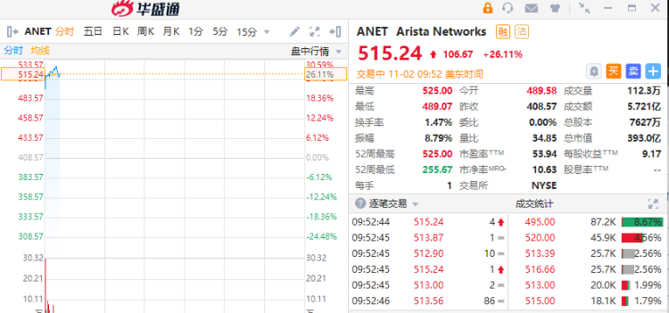 11月2日,网络半导体巨头Arista Networks在超预期的财报支撑下飙升,目前暂涨27.85%。