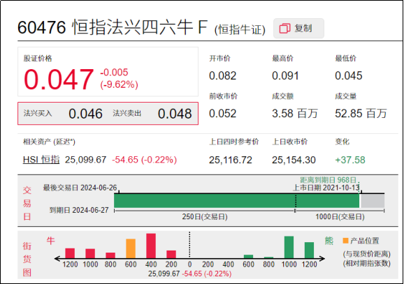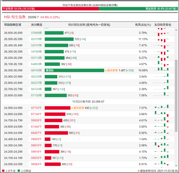 街货分布方面,至周二,恒指牛证街货贴价区间主要在收回价24500点至25000点之间,累计相当约2543张期指合约;恒指熊证街货在收回价25600点至26000点,累计相当约2834张期指合约。