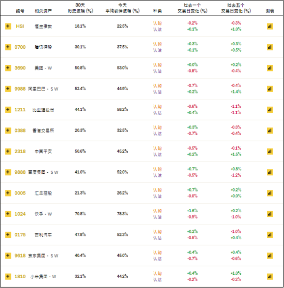 周二恒指相关权证的平均引伸波幅报约22.5%。个股方面,快手、百度等相关认购证的引伸波幅按日调升;美团、京东相关认沽证的引伸波幅则按日调降。