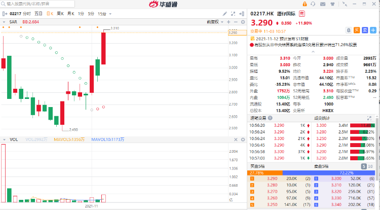 华盛资讯11月3日消息,次新股谭仔国际拉升走强。截至发稿,现涨11.9%,盘中高见3.31港元创历史新高价,近8日累计涨幅达30%,目前总市值达44.1亿港元。