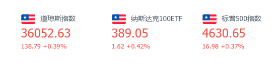 道指涨138.79点,或0.39%,报36052.63点;纳指涨53.69点,或0.34%,报15649.60点;标普500指数涨16.98点,或0.37%,报4630.65点。
