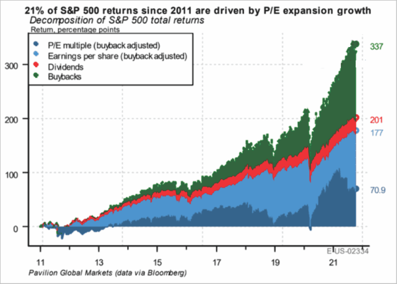 经纪和咨询公司Pavilion Global Markets的图表展示了过去十年股票回购对美股市场的影响,标普500的总回报大致可以做这样的拆分溯源:21%来自市盈率扩张、31.4%来自盈利增长、7.1%来自股息、40.5%来自回购。