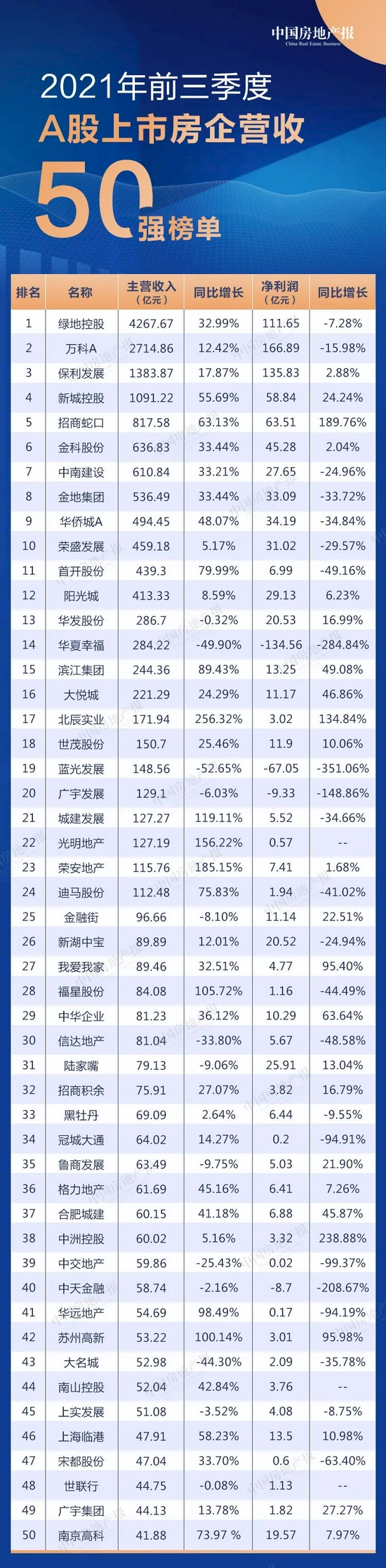 在A股上市房企中,万科、保利发展、绿地控股前三季度净利润规模居前,但相比2020年同期,仅保利发展实现净利润同比增长。