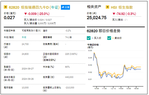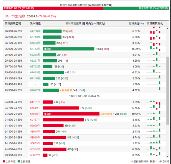 街货分布方面,至周三,恒指牛证街货贴价区间主要在收回价24400点至24900点之间,累计相当约3508张期指合约;恒指熊证街货在收回价25300点至25800点,累计相当约1356张期指合约。