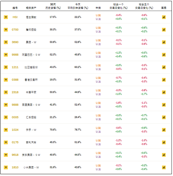 周三恒指相关权证的平均引伸波幅报约22.2%。个股方面,吉利、百度等相关认购证的引伸波幅按日显着调降;平安、小米相关认沽证的引伸波幅则按日调升。