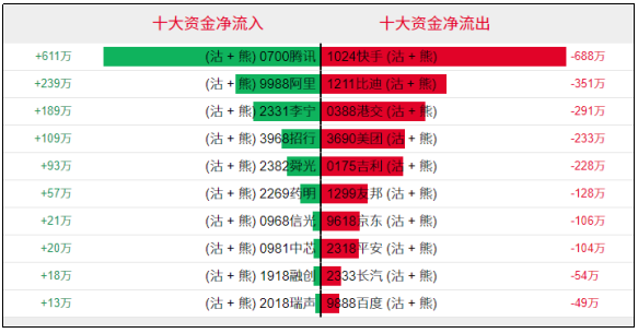 淡仓(认沽证及熊证)方面,周三腾讯、阿里相关淡仓单日分别录得约611万、239万港元资金净流入;相反,快手、比迪相关淡仓单日分别录得约688万港元、351万港元资金净流出。