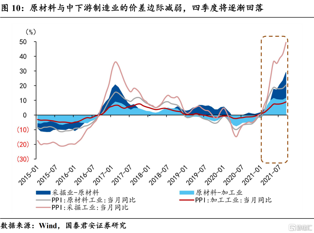 年初至今,利润在行业间分配的格局分化加剧,但目前已有边际趋缓的迹象。供给端,由于碳中和去产能、双控限产等措施,上游采掘业和原材料制造业的价格上涨导致其利润率大幅提升;需求端,中游设备制造业虽然受益于出口高景气,但是成本端压力一直存在,下游消费品则由于疫情的反弹,需求一直较为低迷;电力行业则受到煤炭价格上涨的压制,利润率几乎降至历史低点。但随着四季度限产边际趋缓,叠加出口动能持续、煤炭价格调控等因素,后续利润分配格局有望出现反转。