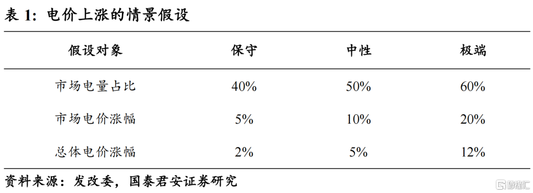 1)在能耗“双控”和电力保供背景下,发改委日前发布文件,要求电力上浮阀门打开,浮动范围扩大,市场化程度提升,同时保持居民、农业用电价格稳定。基于此,我们对下述两个关键指标分别设定三种情形:市场电量占比(40%;50%;60%)、市场电价涨幅(5%;10%;20%);