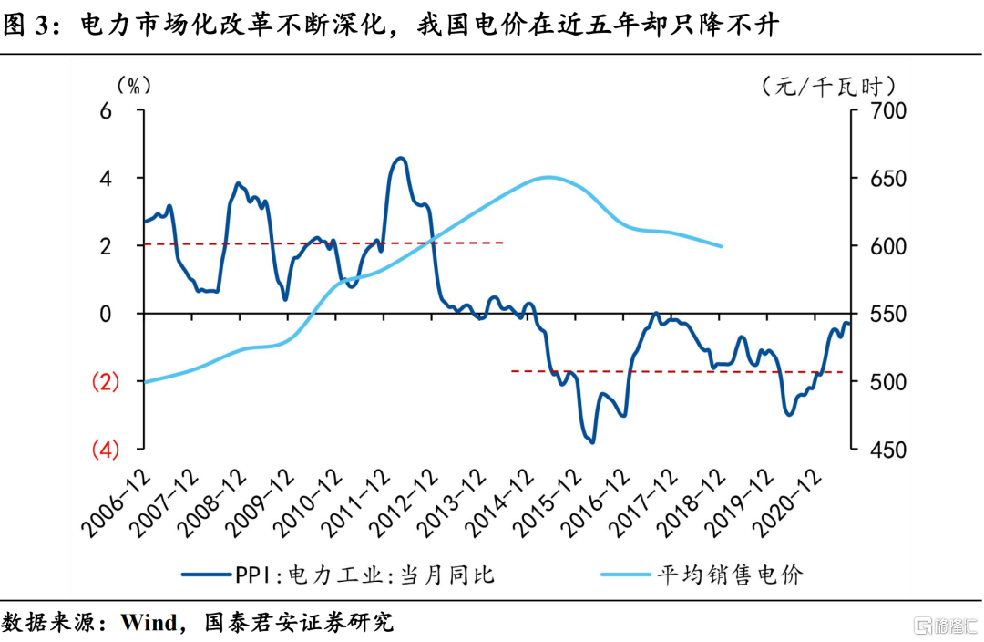 2)在电改过程中,我国逐渐摸索出一种市场化的稳电价方式:基准电价+浮动机制,并于2020年1月1日开始正式实行,这样既能够保证电价信号的顺利发出,又可以避免电价的大幅波动。这种市场化的电价政策是还原电力商品属性的重要基础,但为防止我国工商业用电成本过高,因而暂不上浮。