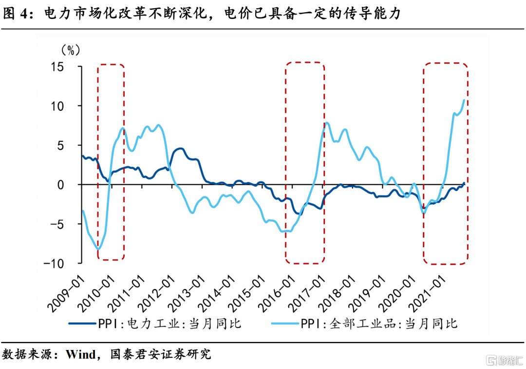 1)在过去,由于电价受政府管制,电价的传导存在时滞和阻滞,因而在通胀阶段,电力部门的成本上升往往很难反映到价格上面。例如,在2009年7月~2010年4月的高通胀阶段,电价在2009年12月才出现上行的趋势,这中间存在5个月的时滞,同时由于电价的传导存在阻滞,因此其上升幅度也非常微弱(不到2%);随着电力市场化改革的不断深入,本轮的通胀(2020年5月开始),电价的传导时滞已经彻底消除,传导阻滞虽有所降低,但依然存在。