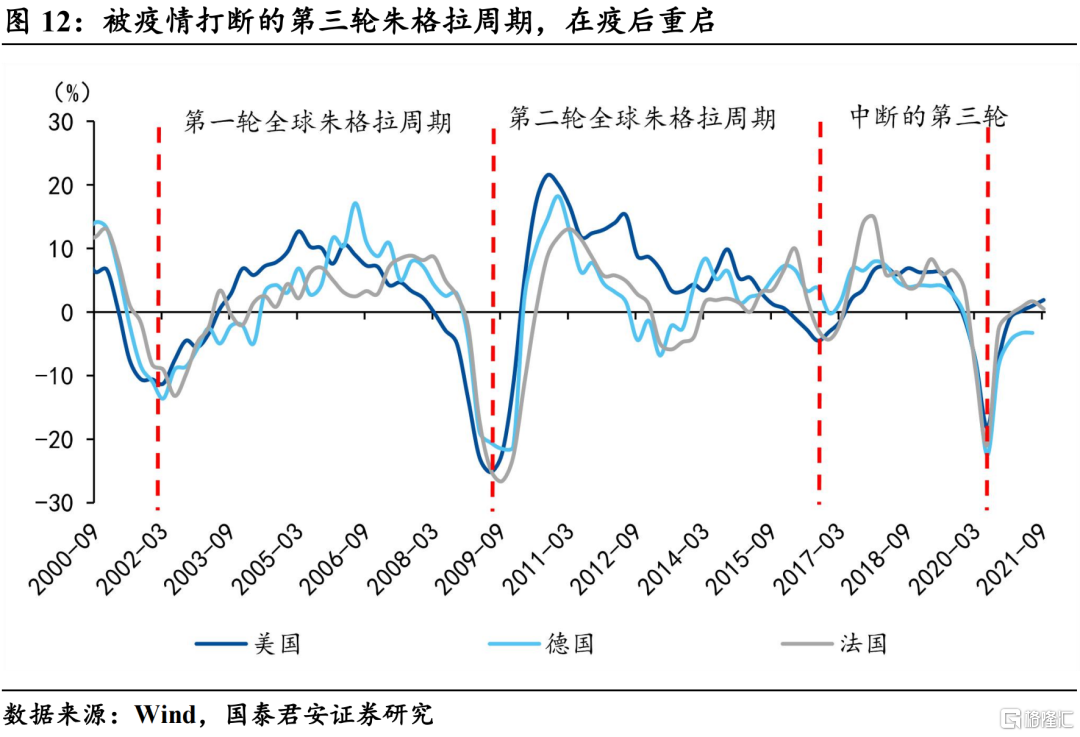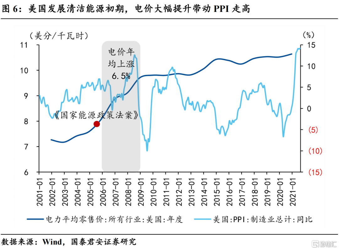 2)欧美发展清洁能源初期电价上涨大幅推升通胀。欧盟和美国在21世纪初就已形成较为完善的市场电力体制,在其大力发展清洁能源初期,电力系统成本提升,在成熟的市场化电力体制下,电价出现了大幅提升,从而推升通胀中枢。