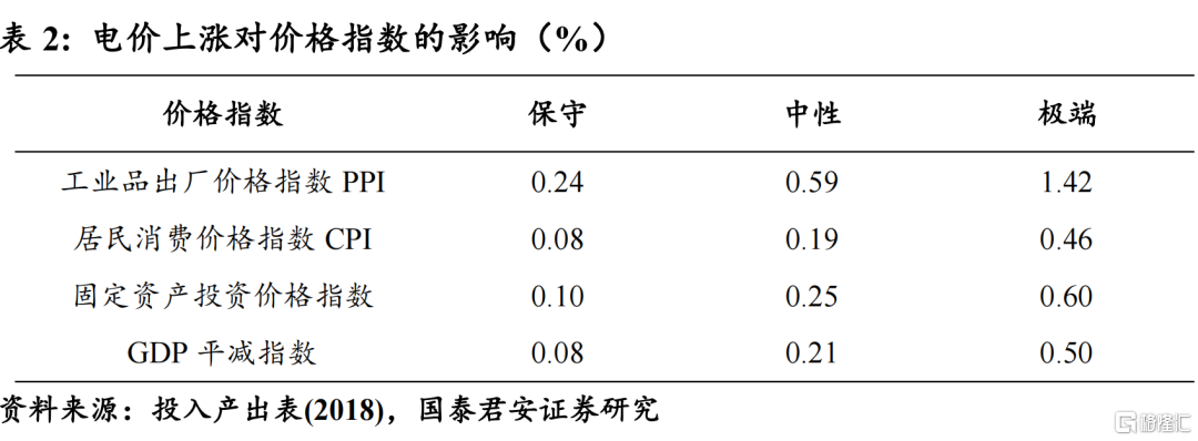 1)电价提升将导致其下游行业成本上升,从而也会做出相应的价格调整,进而导致生产领域中一系列的价格连锁反应。我们首先采用投入产出表来计算出分行业的价格变动,然后通过加权平均的方式来计算一般价格指数(计算方法见附录);