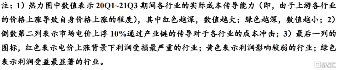 1)在通胀阶段,各行业的成本传导能力(CTC)=实际价格涨幅/理论价格涨幅(成本冲击)。为了测算目前我国的电价实际传导能力,我们采用这一轮通胀周期(2020Q3~2021Q3)作为观察样本,测算每个季度的实际价格涨幅与其在这过程中受到的成本冲击的比值。