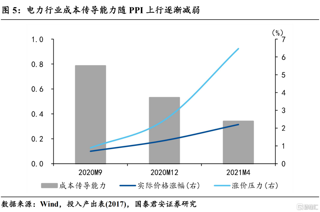 2)我们曾测算了本轮通胀期间电价传导能力,结果表明:电力部门的成本传导能力从2020年9月份的0.78下降至2021年4月份的0.34,说明在通胀初期电价的传导能力不弱,但随着通胀的势头逐渐加强,一方面,电价由于存在上浮限制,其成本传导能力受到约束,另一方面,政府会开始干预,防止电价过高影响工商业的正常生产经营活动。