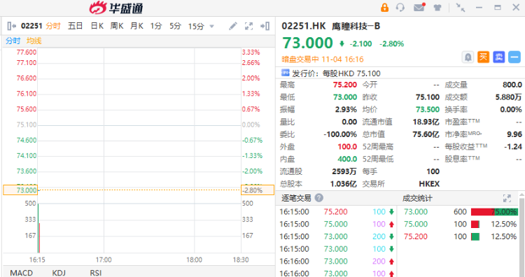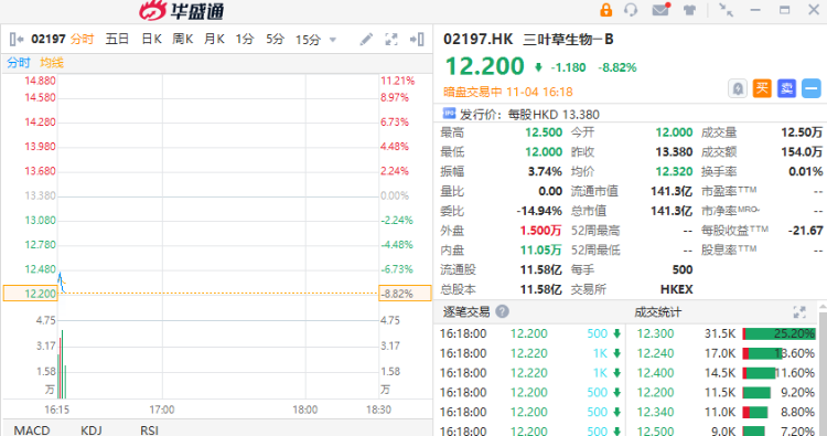 截止发稿,三叶草生物-B跌8.82%,最新总市值超141亿港元;鹰瞳科技-B跌2.80%,最新总市值超75亿港元;这两只新股预计将于明日(11.5)正式上市。
