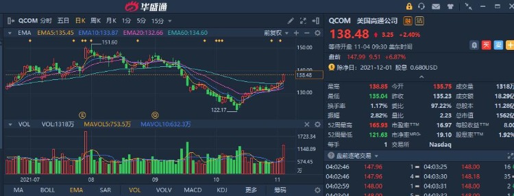 华盛资讯11月4日讯,美股盘前,高通(QCOM.O)盘前涨近7%,第四财季净利润达29亿美元,同比增75%。