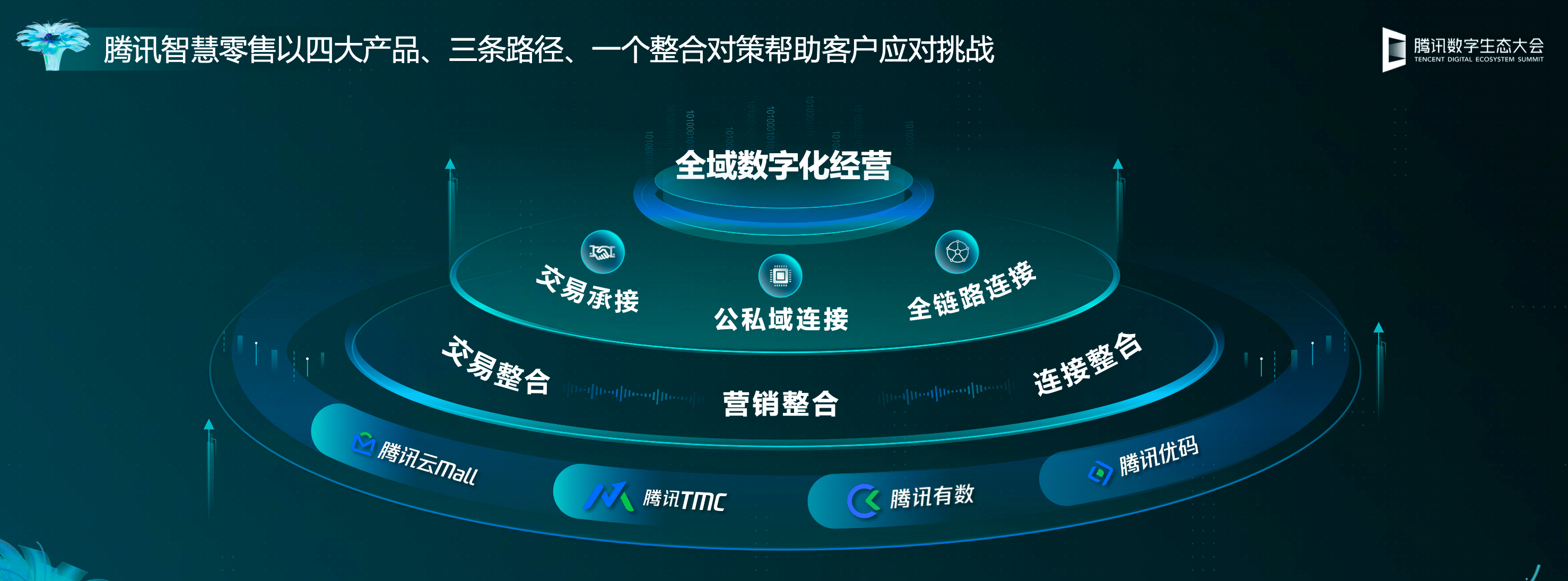 腾讯公司副总裁、腾讯智慧零售产研总裁蒋杰表示,为了应对这些挑战,团队规整思路,推出腾讯云Mall、腾讯营销云、腾讯有数和腾讯优码四大产品,通过交易整合、营销整合和连接整合三大路径,帮助商家应对难关。目前围绕产品搭建起的交易、营销、商品、数据、码五大中台,也会正式开放给合作伙伴。