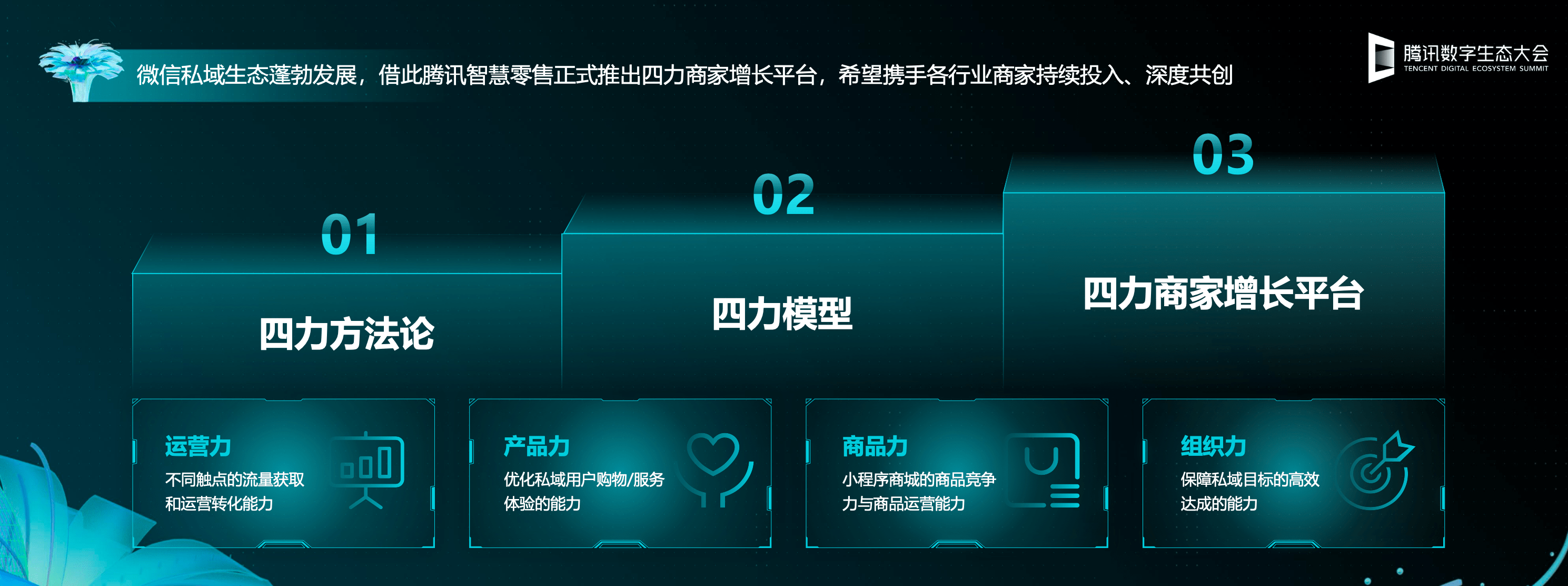 腾讯智慧零售垂直行业总经理王墨在会上表示,为了更好地协助商家,腾讯智慧零售正式推出四力增长平台。该平台由四力增长模型升级而来,后者指从组织力、运营力、商品力以及产品力四个层面切入,为商家的私域能力做精准评估和提升指引。