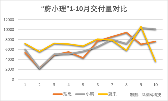 7月、8月连续两个月蔚来交付量排在“小理”之后,8月首次被哪吒赶超,9月再次夺冠后,却在10月交出近乎“膝斩”的成绩。