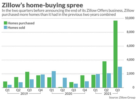彭博社最近报道称,随着房地产市场持续升温,Zillow调整了算法,提高了报价,但事实证明这是致命的。该公司也表示其快速买卖房屋的算法+模式未能按计划发挥作用。