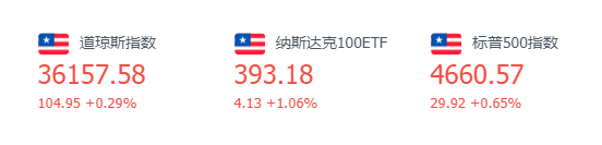 道指涨104.95点,或0.29%,报36157.58点;纳指涨161.98点,或1.04%,报15811.58点;标普500指数涨29.92点,或0.65%,报4660.57点。