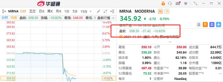 Moderna(MRNA.US)盘前一度大跌逾11%,市值蒸发160亿美元(约1000亿人民币)。 Q3营收49.69亿美元,去年同期为1.57亿美元;净利润33.33亿美元,去年同期录得净亏损2.33亿美元。公司第三季度新冠疫苗营收为48亿美元,销售了2.08亿剂疫苗。