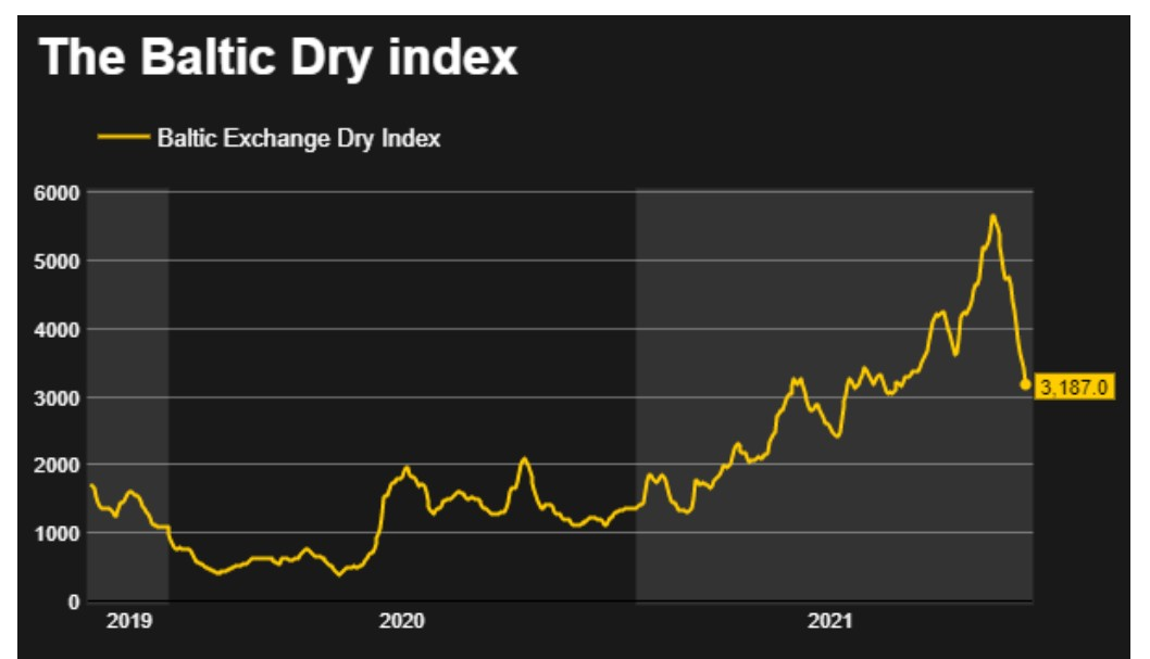 波罗的海干散货指数(Baltic Exchange Dry index)追踪的货运成本在过去一个月下跌约三分之一,此前在10月7日触及2008年以来的最高水平。