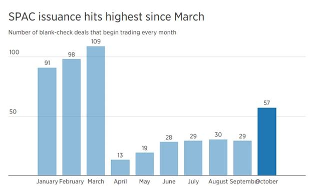 根据SPAC Insider的数据,共有57家特殊目的收购公司在10月份开始交易,这是自3月份发行109家SPAC以来的最高水平。数据显示,10月份的新交易数量几乎是9月份的两倍,也高于去年同期的总数。