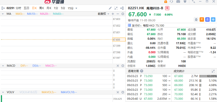 医疗器械企业鹰瞳科技-B $02251.HK 首挂高开低开9.99%,现报67.6港元,不计手续费一手账面浮盈750港元,盘前成交额2.858亿港元,最新总市值70.01亿港元;昨日暗盘收跌2.80%。