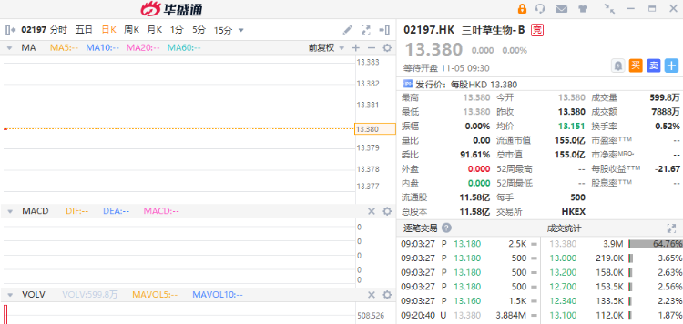华盛资讯11月5日讯,生物制药企业三叶草生物-B $02197.HK 首挂平开。盘前成交额7888万港元,最新总市值155亿港元;昨日暗盘收跌1.20%。
