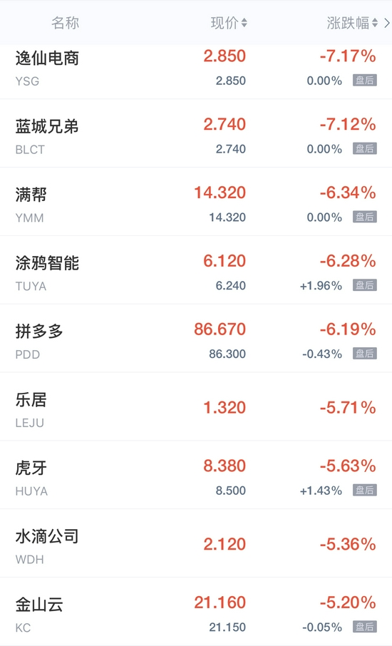 领跌中概股列表: