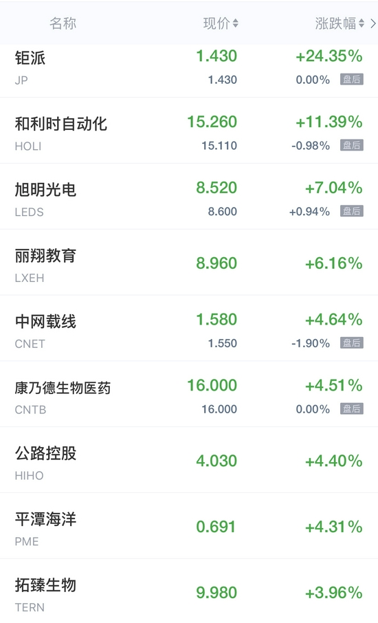 领涨中概股列表: