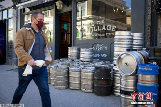 当地时间2021年4月6日,英国伦敦,酒吧工作人员正在为重新开业做准备。