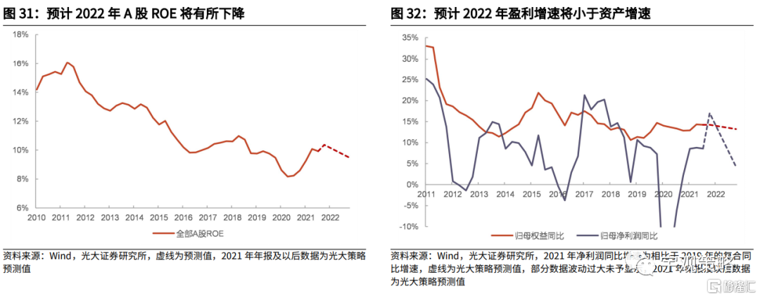 预计2022年企业盈利能力也将拐头下行。在较高的盈利增速之下,2021年上市公司盈利能力整体显著修复,预计2021年ROE将达到10.4%。即使以两年的维度来看,2021年的ROE水平相比于过去几年也维持在了一个较高的水平。不过2022年,企业的盈利水平将会再次进入下行通道。虽然企业盈利仍有望保持正增长,但从以往的经验来看,2022年的盈利增速还是难以超越资产增长速度,进而使得盈利能力下行。