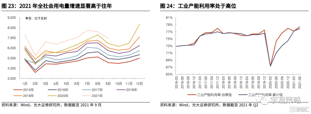其一,需求整体仍然是偏强的,虽然今年以来的经济是在逐步走弱的,但其是在一个较高的水平之下开始走弱的。全年来看,需求的增长中枢仍然处于较高的水平。尤其是工业,在出口高增长的拉动之下表现十分突出。从细分数据来看,无论是发、用电量,还是工业产能利用率情况,都反映出需求的强势,而这也是工业品价格高企的基础。
