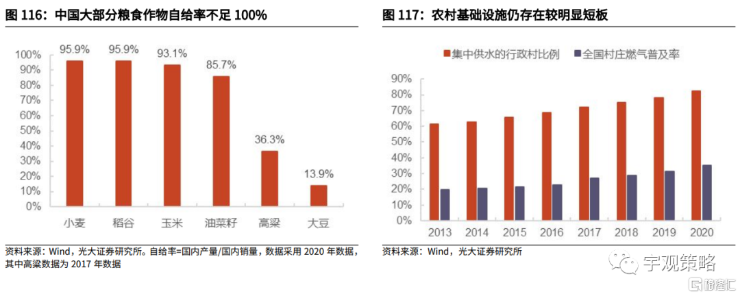 从生态宜居角度看,可关注农村基建、农村污染治理领域。完善的基础设施是实现农村生态宜居目标的前提,同时也对农村产业发展大有裨益。目前,国内农村地区基础设施仍存在较大短板,乡村水、电、路、气、污水及生活垃圾处理领域仍具备发力空间。此外,家电下乡、汽车下乡等农村消费补贴政策也值得关注。