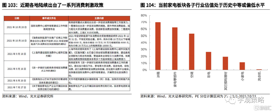 消费补贴与刺激利好家电等大宗消费品。明年国内经济存在较大下行压力,在此背景下,促进消费可能成为稳增长的重要抓手。近期我们已经观察到各地陆续出台了一系列促进家电等大众消费品消费的政策,随着这些政策陆续发力,相关行业业绩也有望迎来修复。这可能也将带来相关行业的估值修复。