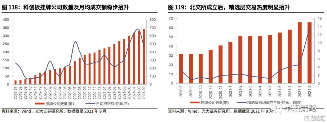 北交所可能将是明年资本市场改革的核心,有望为市场带来新的活力。我们可以以科创板成立之后的表现来作为北交所的参考。自2019年7月科创板正式开市以来,科创板挂牌公司数量稳步增加,同时其日均成交额逐级抬升。未来随着北交所成立之后,也有望盘活存量资产。自北交所正式设立以来,新三板精选层股票交易热度已经出现了明显抬升。