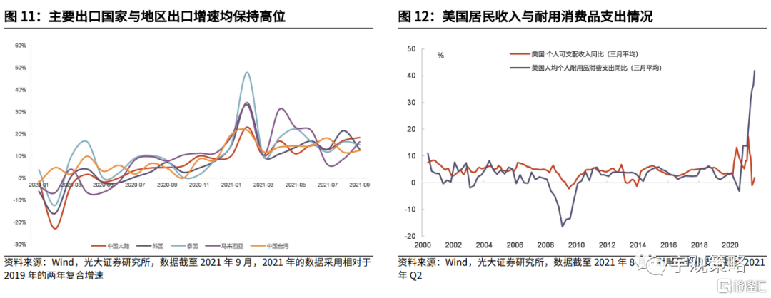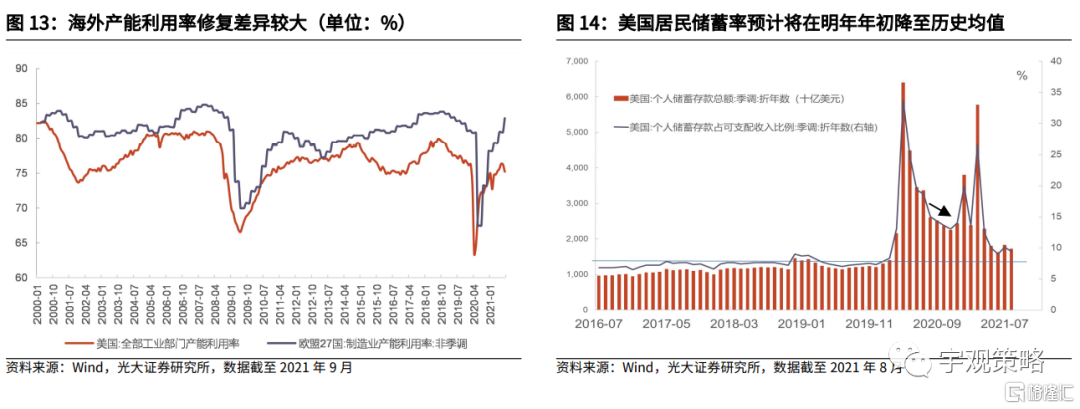 2022年海外需求的拐点将会出现。由于补贴溢出到了居民的储蓄和投资,因此补贴结束之后需求并不会出现断崖式下行。居民会选择消耗储蓄,维持消费。但在补贴结束一段时间,前期累计的储蓄和投资可能都会逐步耗尽,从而带来需求的逐步趋弱。