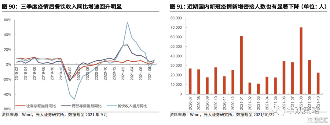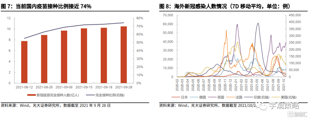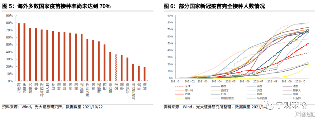 另一方面,国内也开始逐步接近了开放的标准。10月初钟南山院士在接受《南方人物周刊》采访时表示,中国的完全开放有待于绝大多数人都注射了疫苗,接种率起码达到80%到85%以上。根据国家卫健委的数据,目前国内的完全接种比例已经接近了75%,预计2021年底,疫苗的完全接种率将达到80%以上,达到逐步开放的标准。在全球开放的大背景之下,逐步推进对外开放将是必须的。