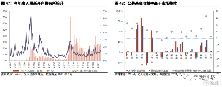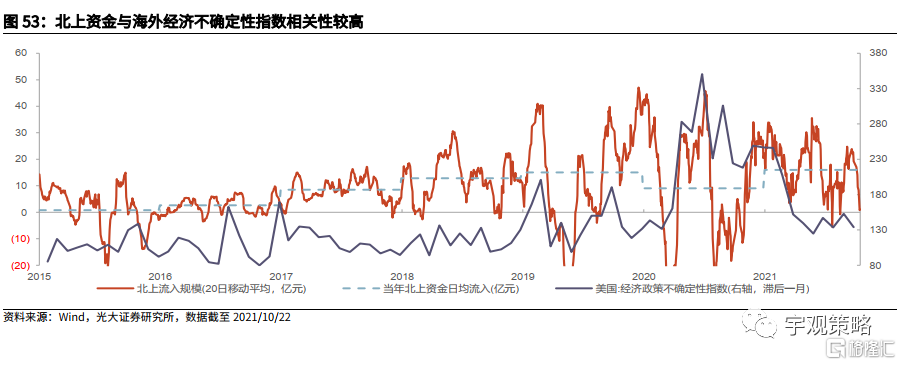 海外资金流入预计也将放缓,关注中美关系缓和的可能。海外资金也是近年来增量资金的重要组成部分,从历史情况来看,海外资金流入情况与美国经济政治不确定性指数有较高的相关性。因此在美国明年经济修复、同时有望看到政策发力的情况之下,美国的经济政治不确定指数或许将有所下行,这将使得海外资金流入A股市场的趋势有所放缓。但如果中美关系出现了显著缓和,可能会吸引海外资金流入。(详见10月11日发布的报告《哪些行业有望受益于中美关系缓和?——策略周专题(2021年10月第1期)》)。