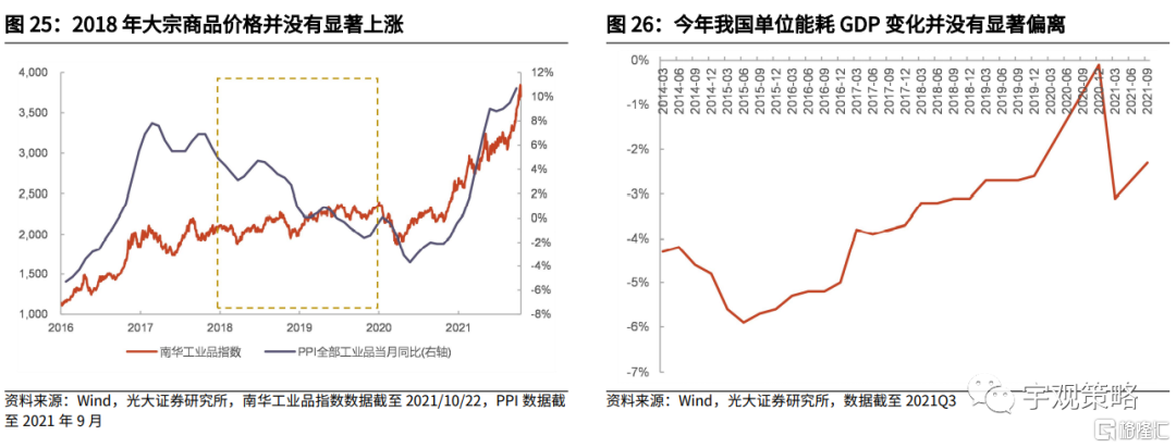 即使未来在碳中和的影响之下供给仍然受到严格的限制,对于价格影响也将有限。即使明年“双控”政策会延续,在需求逐步转弱的背景之下,其影响也难以和今年相提并论。毕竟从能耗水平来看,今年能耗目标并没有显著变化,供给并没有突然的收紧。如果供给收缩只是维持之前的限制,那么产品价格恐怕难以进一步上涨。例如在上一轮供给收缩进程中,2018年开始,国内的大宗商品价格就逐步转弱,直到这一轮需求的回归。