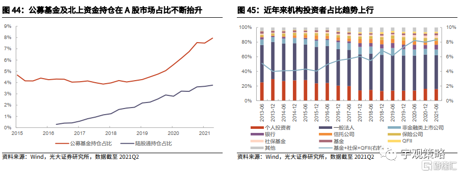 2019年以来,机构在市场中的活跃度有显著提升。得益于2019年以来基金较强的赚钱效应,股市的微观流动性出现了显著的改善。大量的居民资金通过基金流入市场,带动了整体微观流动性的提升,同时结构上,机构资金在市场中的占比也在不断提升。