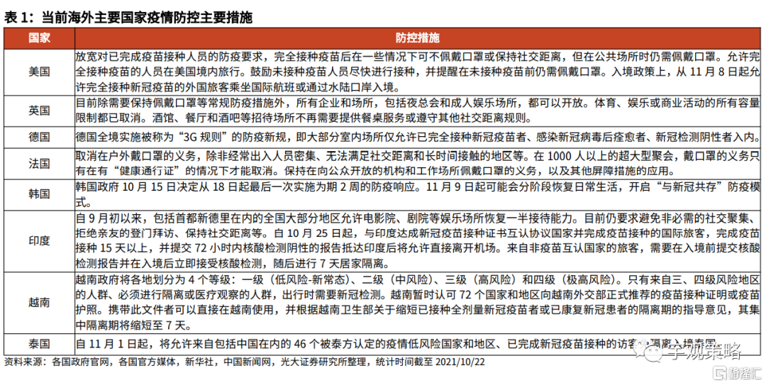 从目前的情况来看,2022年国内将有较大概率对外开放。一方面,目前海外已经开始陆续地放松管制,随着疫苗的接种与经济的压力,很多国家在即使没有达到有效群体免疫的情况之下,仍然逐步开始了对外开放,例如英国、新加坡等。而美国也计划于11月份开始逐步放开边境限制,入境仅要求注射过疫苗以及持有核酸检测证明。海外的逐步开放将可能对国内的入境限制政策形成一定的影响。