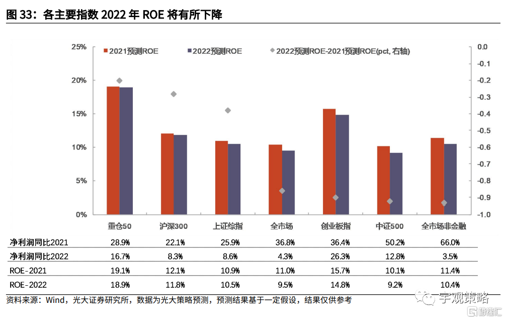 今年四季度可能将是本轮盈利能力改善的高点。从节奏上来看,预计今年四季度上市公司ROE仍将持续上行,并且将达到本轮盈利能力的高点。而2022年一季度开始,盈利能力或许将拐头向下。分板块来看,各个主要指数ROE都将下行,仅有公募基金重仓50等板块的ROE可能能够维持较高水平。