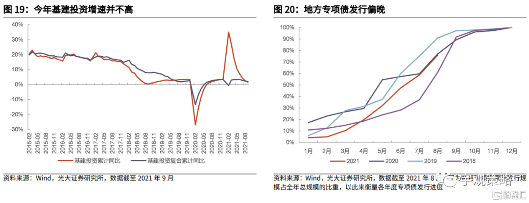 预计明年基建政策将会更加积极。今年专项债的发行节奏显著偏慢,这使得基建增速保持在了一个相对较低的水平。但下半年开始,专项债的发行显著加速,并且可能会出现“发完但用不完”的情况,预计2022年专项债也将保持在一个相对较高的总量水平。两年专项债的叠加对于2022年的基建而言会是有力的支撑。