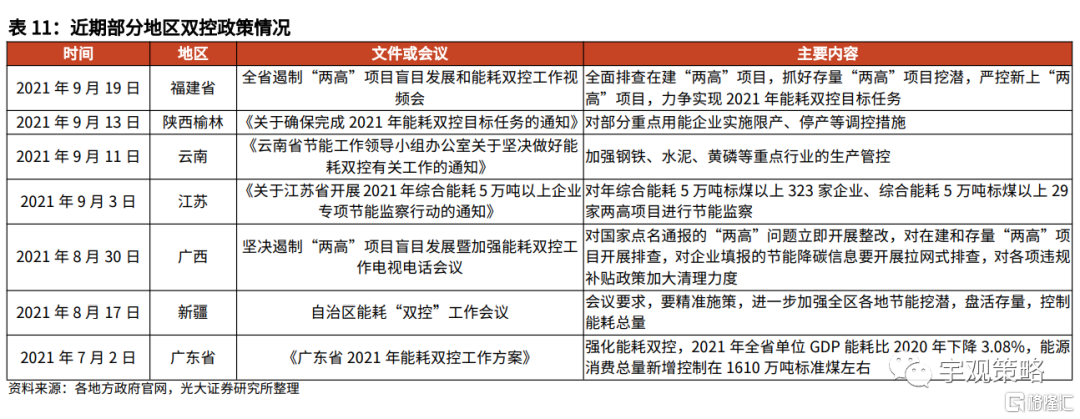 近期能耗双控政策陆续铺开。近期由于电力供应紧张,实施限电限产的地区在不断增加,包括东北、广东、山东、浙江等地区都陆续出台相关政策。这给市场未来一段时间的生产预期带来了显著的扰动。整体来看,需求偏强、较高的上游价格与各地方政府阶段性的政策目标是双控政策开展的主要原因。
