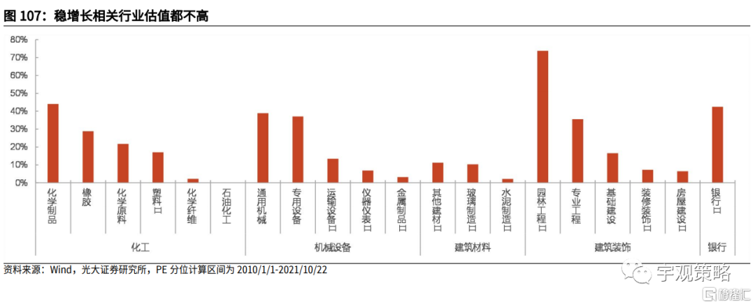 传统基建相关板块估值普遍处于历史较低水平。从估值角度看,以各行业2010年以来PE估值分位来衡量各行业估值水平高低,可以看出,对于化工、机械、建材、建筑装饰、银行等传统基建相关行业而言,除园林工程外,其余稳增长相关二级行业PE估值分位均低于50%,这意味着,绝大多数稳增长相关二级行业估值处于历史偏低水平。建议关注专用设备、水泥制造、基础建设、化学原料等行业。
