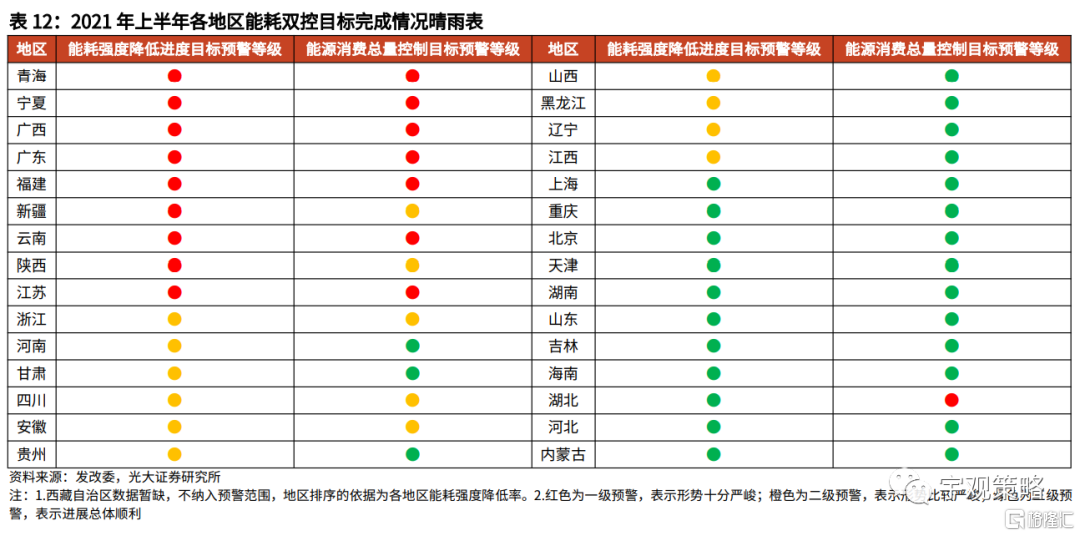各地政府对于“能耗双控”的态度也逐步趋严。今年以来,发改委已经发布了两期“能耗双控”目标完成情况晴雨表,对各地方都有了更加明确的限制,在此影响之下,各地政府年内对于双控目标态度也在逐步趋严,政策落地预期不断提升。