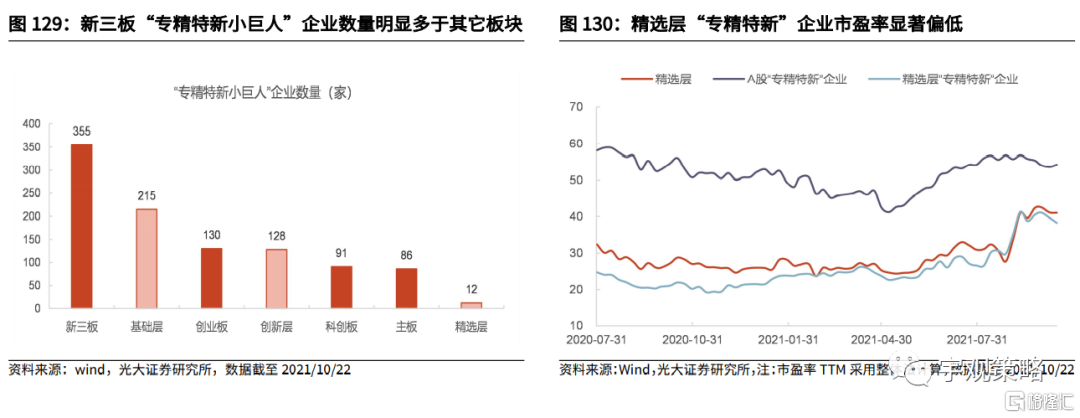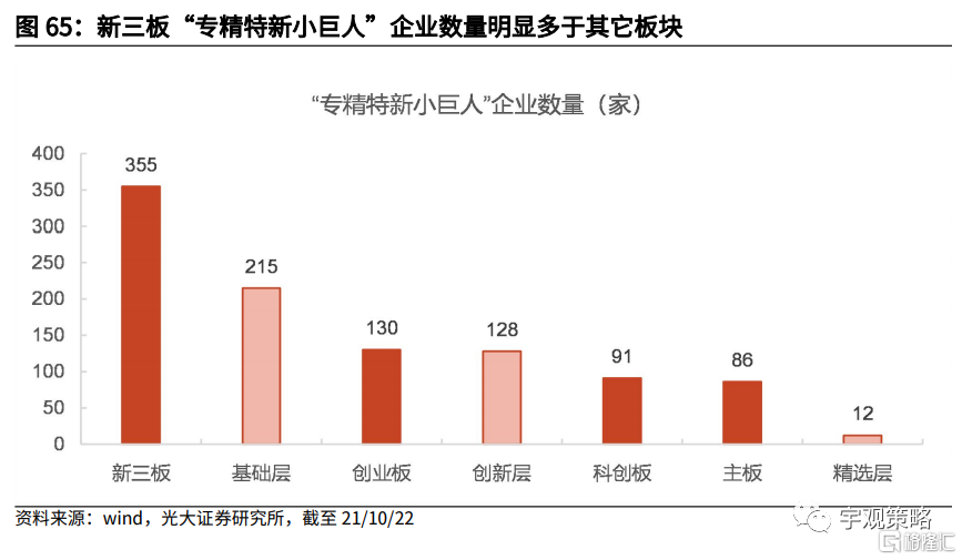 北交所的成立为“专精特新”企业提供了融资新途径。培育一批“专精特新”中小企业是北交所建设过程中的重要目标之一。截至2021年10月19日,新三板共有355家“专精特新小巨人”企业,而创业板、科创板及主板中分别有130家、91家及86家专精特新小巨人企业,新三板在“专精特新小巨人”企业数量上明显多于其它板块。未来北交所有望成为专精特新企业的聚集地。